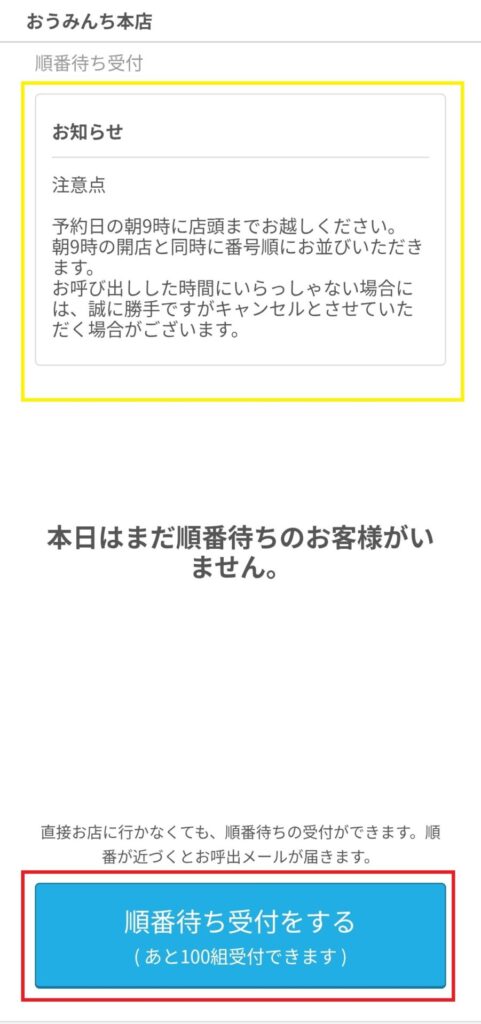 ①予約開始以降にQRへアクセス(PCの方はボタンをクリック)していただくと、上の画像のようなページにアクセスできます。黄色枠の注意点を必ず読んでから、赤枠の[順番待ち受付をする]をクリック(スマホの場合はタップ)してください。