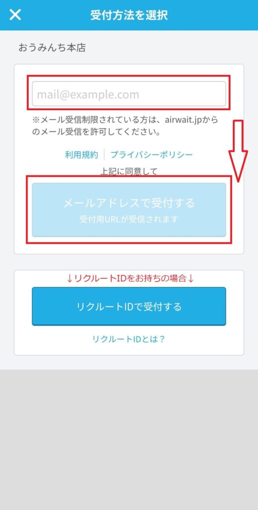 ②上の赤枠にメールアドレスを入力後、利用規約、プライバシーポリシーに同意いただき、[メールアドレスで受付する]を押してください。