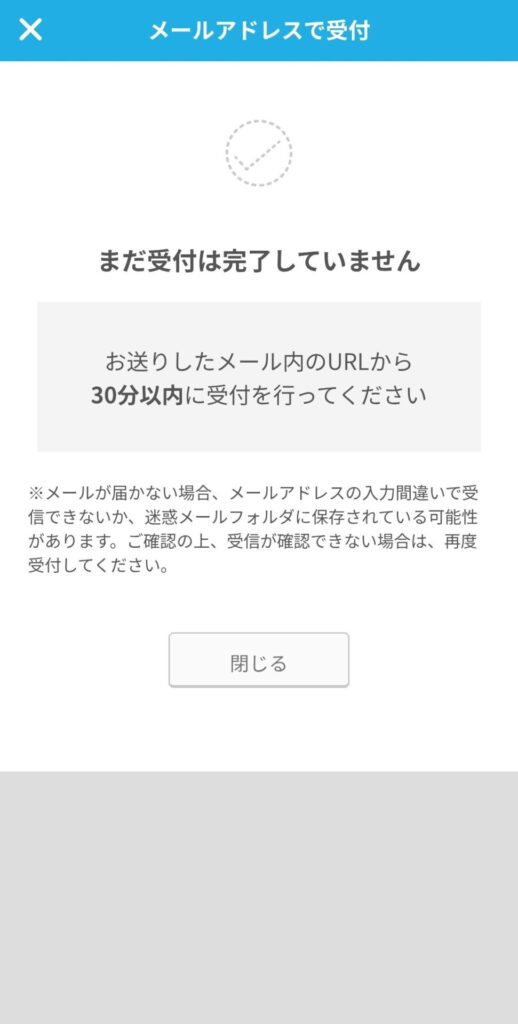 ③こちらの画面になりましたら、先ほど②で登録したアドレスにメールが届きますので、メールやメールアプリを開いてください。