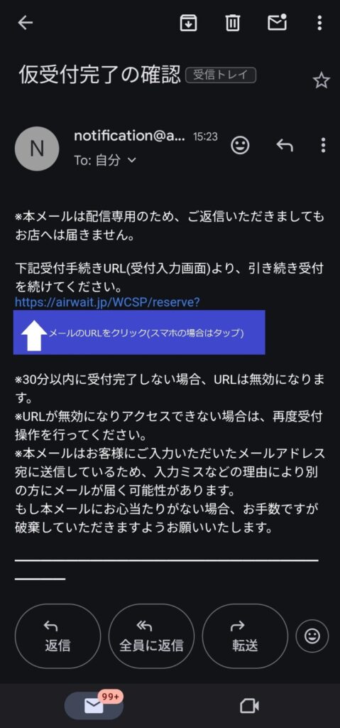④仮受付完了の確認というメールが届いておりますので、メール内のhttps://airwait.jp~から始まるURLにアクセスする。