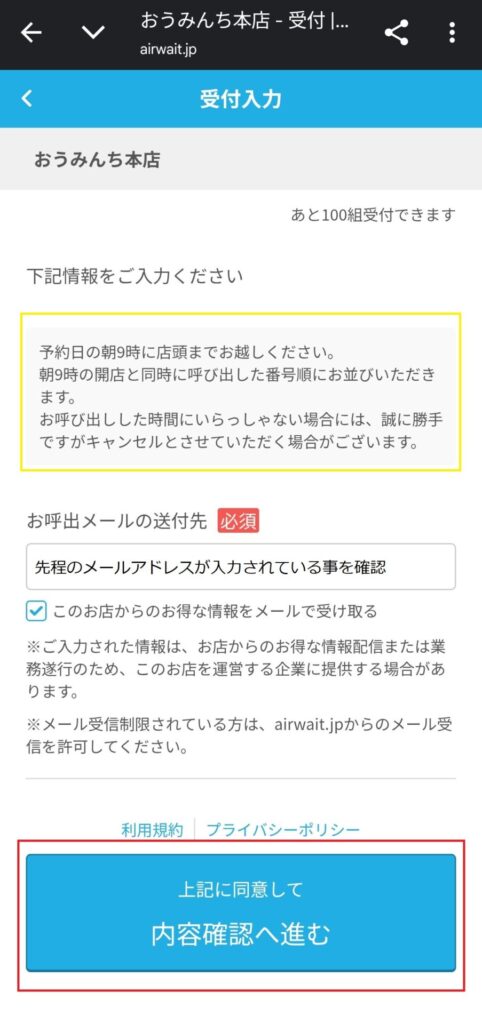 ⑤黄色枠の説明を良くお読みになった上で、お呼び出しメールの送付先にご登録のメールアドレスが入力されている事をご確認いただき、赤枠の[内容確認へ進む]のボタンを押してください。