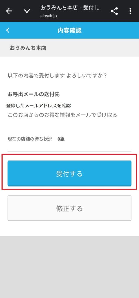 もし変更がございましたら下の[修正する]を押していただき、修正後改めて受付するを押してください。