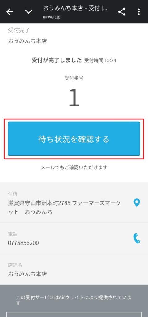 ⑦受付が完了と出ますが、赤枠の[待ち状況を確認する]のボタンを押してください。