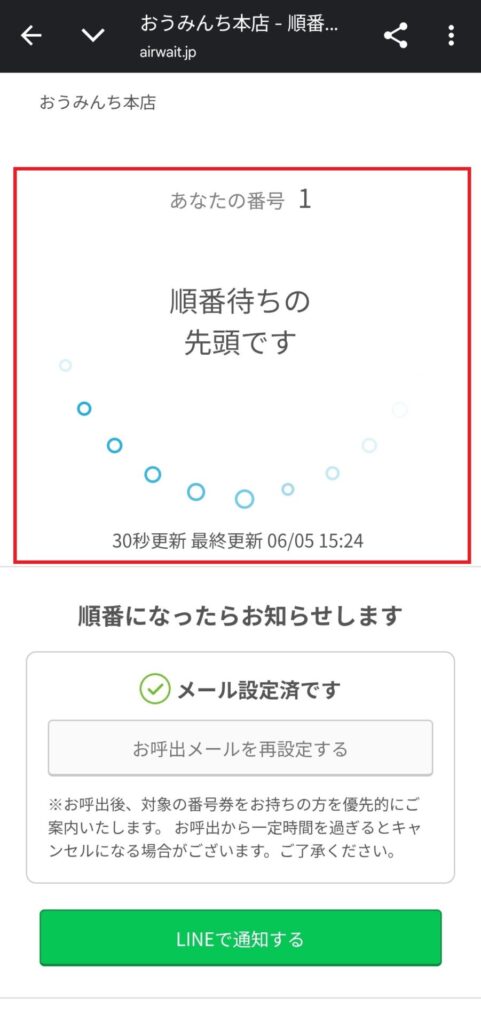 ⑧待ち状況確認ページが開きますので、こちらのページを当日お並びの際は係の者に見せていただくようお願いいたします。